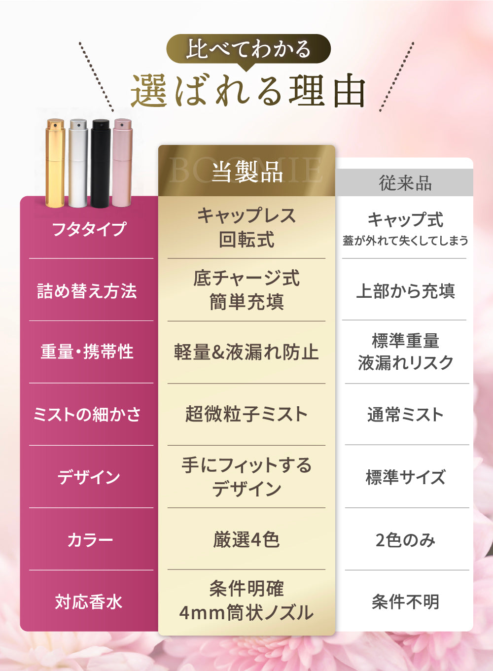 BOOMIE アトマイザー BOOMIE アトマイザー ¥1,490 カラー ローズピンク メタリックゴールド シルバー ブラック カートに入れる Amazonで購入 楽天で購入 60日間品質保証さまざまな決済方法が利用可能 お届け時期・送料・お支払い・返品について レビューを書く